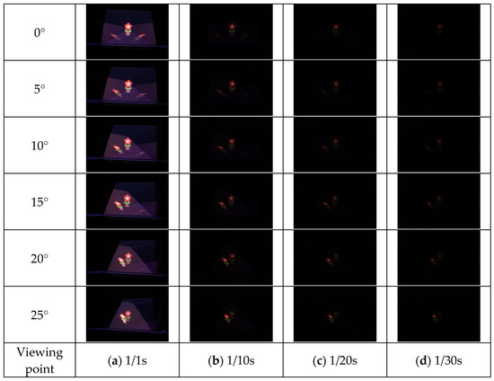 The results of each method are shown in Figure 15, Figure 16, Figure 17 and Figure 18. Here, the camera shutter speeds were set to 1/1 s, 1/10 s, 1/20 s, and 1/30 s to suppress the effects of ghost blackouts and whiteouts of the aerial image. In addition, because the MMAP used had a viewing angle of 20° from left to right, images were captured in 5° increments from 0° to 25° horizontally.