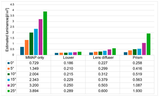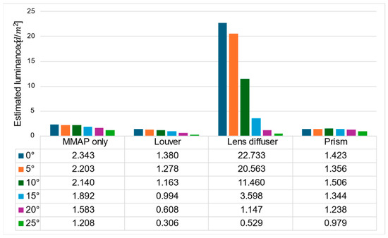 Figure 19 and Figure 20 show the estimated luminance values for each angle of the aerial image and the ghost for each method, respectively.