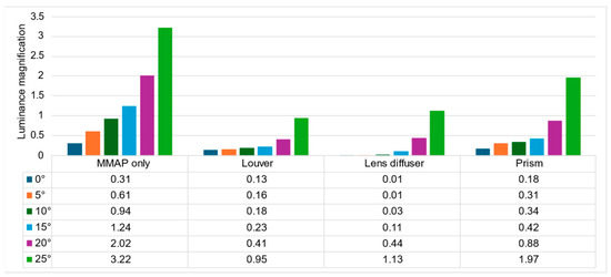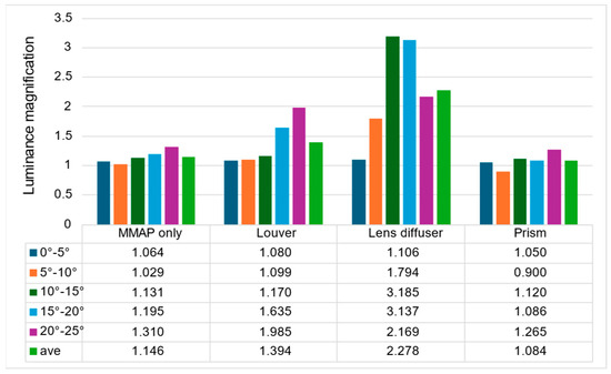 Figure 19 shows that the prism-based method produces a higher luminance for the aerial image at all angles than the louver-based method. This may be because a louver blocks light as the angle increases, but the prism does not; therefore, the luminance does not decrease significantly. In addition, the luminance of the aerial image with the prism is lower than that of the aerial image with the lens diffuser from 0° to 15° and higher at 20° and 25°, which is considered to be because the prism emits light over a wider range than the lens diffuser. Figure 21 shows that the prism-based method eliminates ghosts better than MMAP alone and has the highest luminance of all ghost elimination methods. This is because the prism-based method cannot remove rays at 30° or more to the left or right, which are more likely to cause ghosting. Figure 22 shows that the prism method reduces the average luminance ratio of the aerial image by 6.2%, 31.0%, and 119.4% compared with MMAP-alone, louver, and lens diffuser methods, respectively. Therefore, we confirmed that the proposed method could reduce the luminance irregularity of aerial images better than the conventional ghost removal methods. Figure 19 also shows that luminance irregularities also occur in the case of MMAP alone. This suggests that angle-dependent luminance irregularities may exist in MMAP as well, and we would like to address this issue in the future.