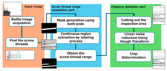 To improve productivity, it is necessary to develop a detection device using image processing [1,2,3]. Many inspection methods using image processing have been proposed [4,5,6,7]. However, their targets are plastics and metals, and if the glass bottle is transparent, it cannot be inspected successfully due to its light-transmitting characteristics. In addition, glass bottle mouth inspection methods using image processing include a glass bottle mouth inspection method employing dynamic brightness value correction [8] and a glass bottle inspection method using ring-shaped inspection gates [9]. The former uses six cameras for side inspections and two cameras for top inspections to perform omnidirectional inspection. However, it is limited to inspecting simple-shaped glass bottles without screw threads, and the accuracy of flaw detection is low because of the use of natural light. The latter captures images from above but cannot inspect the entire screw-threaded portion effectively. To address these challenges, we propose improving the detection accuracy through the use of an infrared backlight and limiting the inspection area to critical regions.