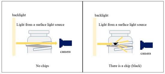 An infrared surface light source and an infrared camera are employed for image capture. Since the glass bottles used in this study are transparent, light penetrates the smooth, undamaged surface when photographed under an infrared surface light source, resulting in a uniformly white appearance. However, the presence of chips or scratches causes diffuse reflection of light, making these areas appear darker. This optical property is utilized for defect detection. Figure 2 shows an overview of the glass bottle photography process, which simulates the way chips appear when infrared light is used. Additionally, a cut filter is applied to block ambient light, ensuring that inspections remain unaffected by external lighting conditions in the factory or inspection area.