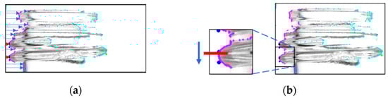 To obtain the screw threads, a search was first performed from the endpoints of the glass bottle. Figure 3a shows the scan starting from the upper-left corner of the captured image. The coordinates of the first pixel with the lowest luminance value, which corresponds to the outline of the glass bottle, were retained. The leftmost and second points from the left were retained as the endpoints of the screw threads based on the coordinate information of the outline. Subsequently, the top and bottom edges of the screw threads were determined by scanning a few pixels above and below the retained coordinates and selecting the two coordinates that fell within the specified pixel range. A similar scan was performed on the right side to locate the end of the screw thread. Figure 3b illustrates this process. The black dots indicate the ends of the screw threads, and the blue dots indicate the top and bottom coordinates determined during this process.