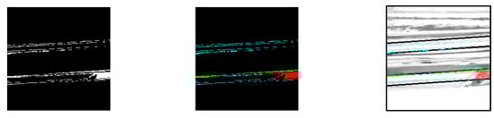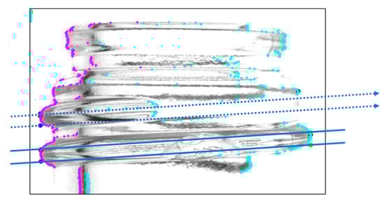 Therefore, a mask image was generated to accurately identify the screw thread missing on one side. As shown in Figure 5, the mask image was created with a thickness sufficient to cover the top and bottom of the screw thread. The endpoint of the screw thread was then located by detecting a shadow area that is continuous above and below the screw thread. This mask image was generated based on the slope obtained during the determination of the screw-thread range when both endpoints were successfully connected.