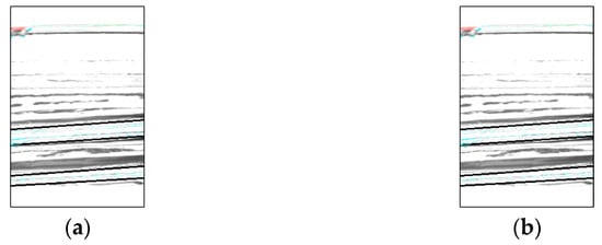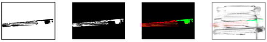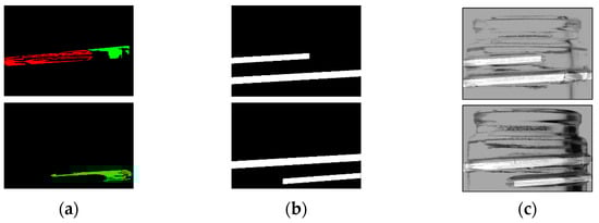 Based on the labeling information obtained, a mask image was generated to match the screw thread range. The generated mask image and the bottle image synthesized using the mask are shown in Figure 7. For example, the red label information is used to identify the screw thread regions contiguous from the left, and the green label information is used to identify the screw thread regions contiguous from the right.