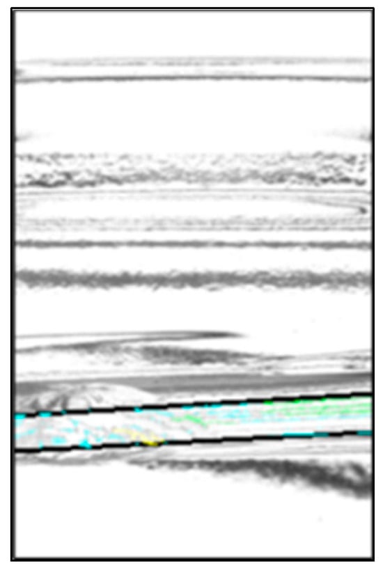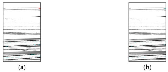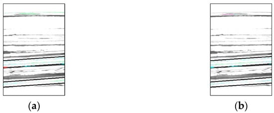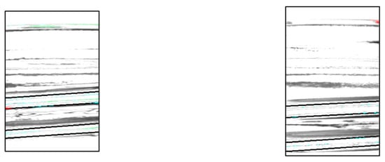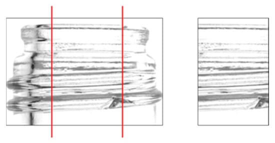 Chipping detection performed on the entire bottle image can be significantly affected by shadows in areas not visible in the front view. To minimize the influence of these shadows and improve chip detection, only the center portion of the bottle image was cropped using the coordinates of the two endpoints identified in Section 2.3. An example of this cropping method is shown in Figure 8. Because one image was acquired by the left camera, two images by the center camera, and one image by the right camera for flaw detection, it was possible to perform 180° flaw detection even when only the center portion of the image was used.