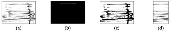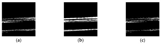 As described in the previous sections, an image containing only the screw threads was obtained; however, it included significant linear noise owing to the shadows cast by the screw threads. To remove this noise, linear line detection using Hough transform processing was performed [14,15]. Labels identified as straight lines are removed by generating a mask to exclude them from the detection target. Figure 9 illustrates the mask generation process.