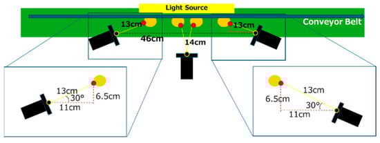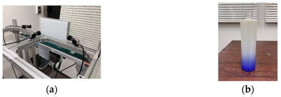 Figure 11 illustrates the experimental environment and the glass bottles used in the study. Table 2 lists the components and their specifications for the experimental setup. In addition, Figure 12 provides a detailed diagram of the camera arrangement. A constant voltage controller was utilized for image capture, with the light intensity set to its maximum level and maintained at a constant value. A cut filter was applied to block wavelengths other than 850 nm, effectively eliminating ambient light interference.