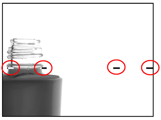 Table 7 and Figure 24 and Figure 25 show the additional proposed method improved inspection accuracy for good bottles. However, for defective bottles, two false positives occurred, which did not occur in Experiment 2. An example of a false-positive detection is shown in Figure 26. The accuracy of the inspection was reduced because the addition of pixels caused some pixels to be missing from the image, making it difficult to accurately identify the missing areas.