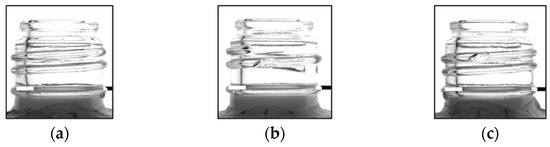 In this study, a detection of 180° was achieved. To verify the detection rate of the half-face (180°) of the bottles using this method, one good and two defective bottles (D1 and D2) were placed on the conveyor belt, and their images were acquired 10 times at 30° intervals, resulting in a total of 210 images, to ensure that the method could accurately inspect them. One bottle with chips on both the top and bottom of the screw threads was selected as the sample to confirm that there were no issues in detecting flaws during the acquisition of the screw threads. Figure 14 shows images of one good and two defective bottles acquired using an infrared camera.