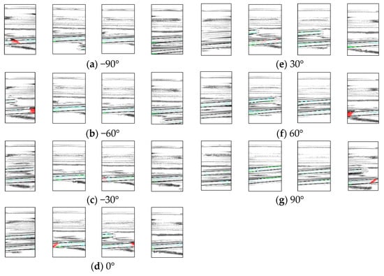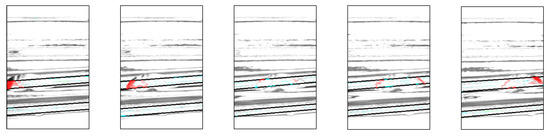Figure 15 shows a portion of the resulting image, with the chipped areas indicated in red, indicating successful detection. The image shows the D1 rotated by 30°. In addition, Table 3, Table 4 and Table 5 present a breakdown of the experimental results. Table 3 presents the results of inspecting good bottles 10 times per angle, Table 4 shows the results of inspecting D1 10 times per angle, and Table 5 shows the results of inspecting D2 10 times per angle.