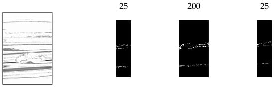 In addition, when images of bottles with chips were acquired from multiple angles, it was observed that when the chips were in front of the image, the reflection was weak, making it difficult to identify the chips. Based on this observation, the inspection image was divided vertically, as shown in Figure 22, and different binarization thresholds were applied to each section.
