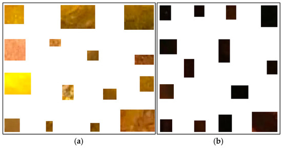 Previously, we proposed a method to classify pixels pertaining to the intestinal mucosa, residues, and artifacts in a colonoscopy frame based on their color contents [4]. The pixels pertaining to intestinal mucosa are mostly in shades of red to brown. Residues are mostly colored from yellow to brown, while artifacts are mostly white or certain saturated colors (e.g., orange, green, or blue). In order to capture all pixel color nuances inherent to the intestinal mucosa, we developed a routine that helps a user to parse colonoscopy frames. When the mucosa is clearly seen, it allows the user to mark, extract, and save a small rectangular area of the image which best describes the mucosa in terms of its color nuances. We used 209 intestinal mucosa image samples (examples are shown in Figure 2) to obtain the results presented in this paper. The same routine was used to develop a collection of 84 image samples reflecting residues (see Figure 3a). While we had image samples collected for artifacts and lumen in the beginning, this approach was not sufficiently productive in either case (we still used 154 image samples for the lumen; see Figure 3b). Thus, in these cases, we found other solutions that will be explained later in this paper.
