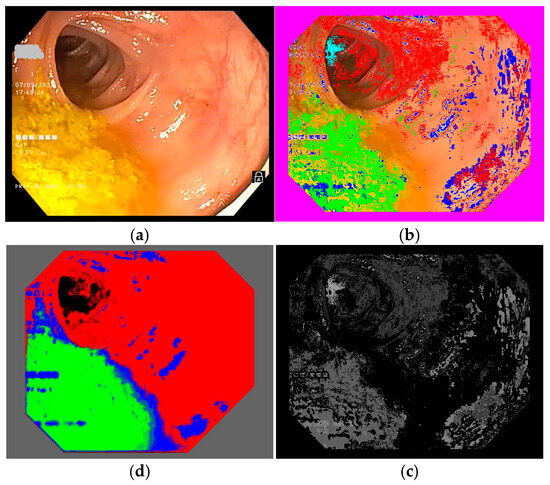 Another limitation is the neural network’s performance in terms of detecting artifacts. There have been various studies focused on leveraging AI for the detection of image artifacts, particularly in the context of gastrointestinal endoscopy. One such study developed a specialized AI algorithm designed to enhance the detection of artifacts in gastrointestinal images, with the goal of quantitatively evaluating the quality of endoscopic visualization [38]. The researchers compared their model to conventional neural networks typically used for image analysis and found that their algorithm significantly outperformed the standard models, achieving higher accuracy in identifying and classifying artifacts [38]. Such an improvement in artifact detection is crucial, as it allows for a more precise assessment of image quality, ultimately leading to better diagnostic outcomes. The ability to accurately distinguish between useful image data and artifacts enhances the reliability of subsequent analyses, helping clinicians to make more informed decisions during medical procedures [38,39]. Frames with significant artifacts can skew pixel statistics, especially for the residues and mucosa. Enhancing the network’s ability to identify artifacts more accurately will be a priority in subsequent research; for instance, we will try to provide a special method to detect each type of artifact, such as bright white spots caused by reflections, which will be handled by a dedicated routine, and error messages overprinted in blue from the colonoscope, which will be treated using another routine. This approach is expected to enhance the precision of artifact detection.