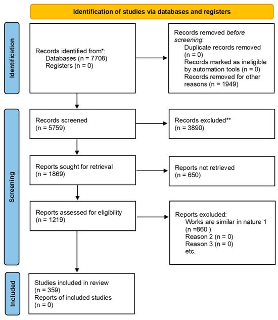 - Inclusion:After completing the eligibility assessment, 359 studies met the inclusion criteria and were included for detailed analysis. These studies represent a broad range of sensor modalities, machine learning methodologies, and emerging trends in HAR research. The selected studies provide valuable insights into the field, addressing key challenges and identifying potential research directions.