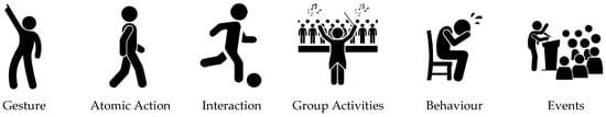 Human activities encompass a broad spectrum of actions and behaviours that can be classified into several categories based on their nature and complexity, as illustrated in Figure 3. These categories, widely recognised in the literature [65,66], provide a structured framework for understanding the various types of activities performed by humans.