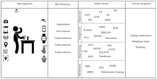 Following data acquisition, the next stage is data pre-processing, which aims to improve data quality and extract the relevant features necessary for activity classification. Pre-processing techniques include data cleaning to remove irrelevant or erroneous data, data filtering to eliminate noise, normalisation to standardise the data, and background removal in the case of video data. Additional techniques such as feature extraction, data segmentation, feature selection, and dimensionality reduction are applied to prepare the data for model training and to enhance the accuracy of subsequent activity recognition stages.