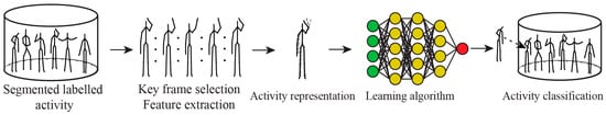 Once the data have been pre-processed, the focus shifts to model selection and training. In this stage, the most suitable machine learning or deep learning algorithms are chosen based on the nature of the data and the specific activity recognition tasks. This involves configuring model architectures, optimising hyperparameters, and training the model using labelled training data to develop robust models capable of accurately classifying activities from sensor data in real time. In cases where labelled data are unavailable, unsupervised methods are applied to estimate the number of activities in the dataset. Techniques such as clustering are used to group similar data points, after which class labels are assigned by examining cluster centres or random cluster members [76].