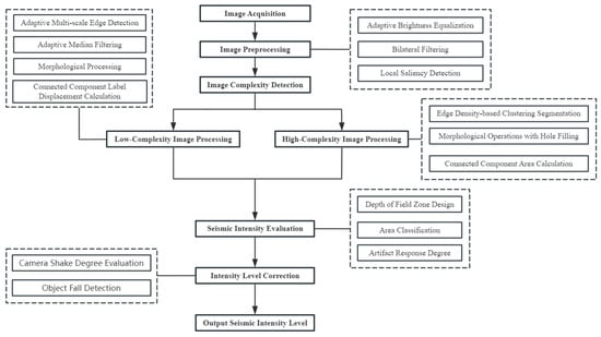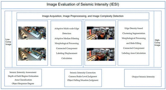 The current study designated areas such as the ground, walls, and ceiling as the background, while considering all other objects as the foreground. By analyzing the movement patterns of the foreground objects, the earthquake intensity was calculated. The detailed steps are visualized in Figure 9.