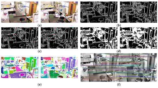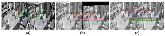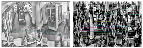 The K-nearest neighbor matching algorithm [] was adopted to match feature points, and the matching feature points were judged according to the distance difference between the nearest neighbor and the second-nearest neighbor of the matching feature points. In this way, the accuracy of the matching feature points was improved. The K-nearest neighbor matching algorithm has a simple structure, a fast operation speed, and high stability. We set the difference threshold coefficient to 0.8.