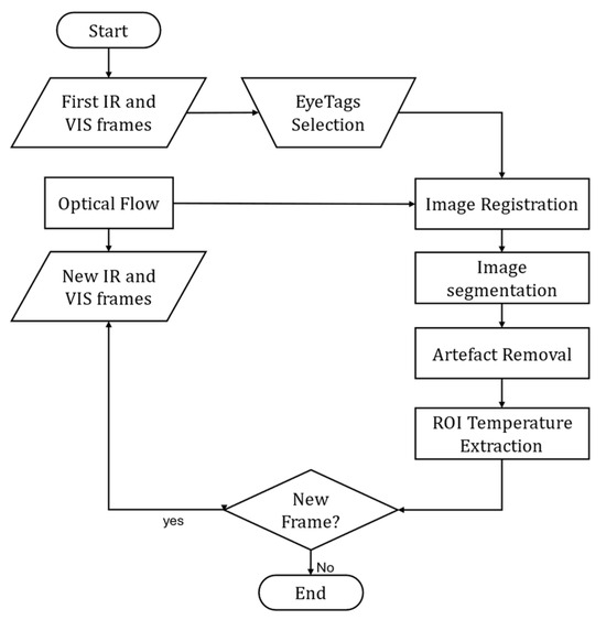 In this paper, improvements to the ThermOcular system were presented, which enhance its utility for assessing OST. The segmentation process has been substantially improved, allowing for a more accurate identification of key ocular ROI, such as the cornea and sclera. This refinement permits precise temperature readings across the ocular surface, which is crucial for diagnosing a wide range of ocular conditions. Moreover, robust methods were developed for removing artifacts, such as eyelashes and blinks, from the IR images, thereby improving the reliability of OST measurement. The registration process was also optimized by the use of EyeTags to simplify clinician use, reducing the need for extensive training on CP selection and minimizing errors in manual input. Figure 5 shows the revised algorithm flowchart of the new ThermOcular System as result of the conclusions in this study.