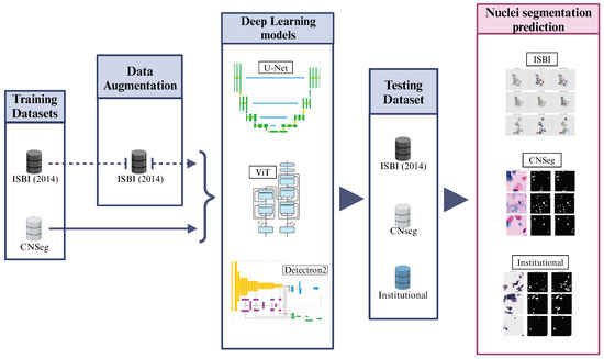 The method pipeline of our study is described in Figure 1. Using public databases, we conducted a study involving different DL methods for nuclei segmentation in liquid-based cervical cytology images. We tested them on our dataset, which consists of WSI cervical cytology images, as described in the following sections. The experiments were performed on Google Colab Pro with a T4 GPU and high RAM capacity. Finally, we compared the performance of the tested DL models with the literature, considering studies that used the same public databases and those that reported performance on their private datasets.