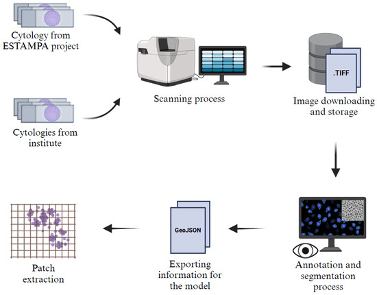 A description of the acquisition and preprocessing pipeline of the Institutional dataset can be seen in Figure 2. Our dataset consists of 247 patches or images of 512 × 512 pixels, randomly extracted from liquid-based cytology whole slide images WSIs scanned with the VENTANA DP600 slide scanner (Roche Diagnostics, Basel, Switzerland), configured at 40× magnification with three layers and a spacing of 1.0 microns. The images originate from two sources: 48 cytology samples from the ESTAMPA Project [29], reviewed by experts from the International Agency for Research on Cancer (IARC, Lyon, France), and 199 cytology samples collected in an ongoing study at the Instituto Nacional de Cancerología of Colombia (INC), which aims to collect liquid-based cytology samples from women in different regions of Colombia.