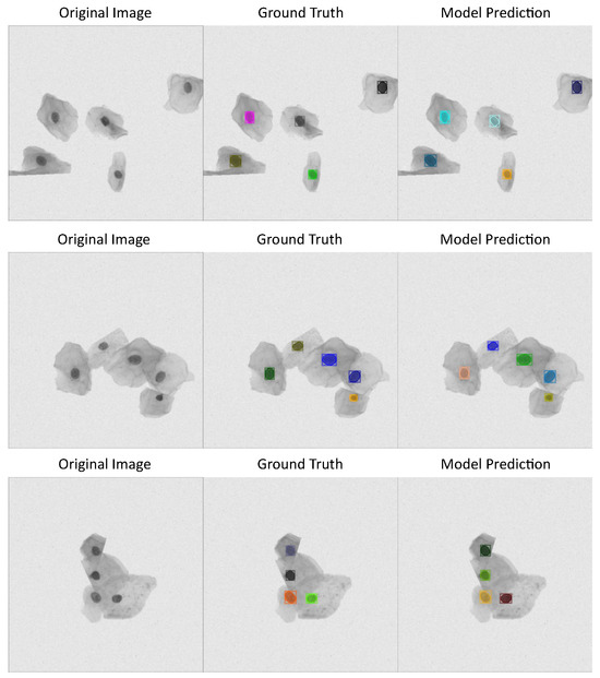 See Figure 3 with three different cervical cytology images from ISBI 2014 dataset, their corresponding annotations, and the predictions made by detectron model, which has the best performance metrics according to Table 1.