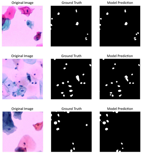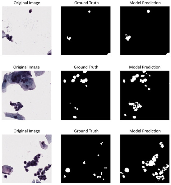 U-Net model results using CNSeg dataset: first column shows cervical cytology images, second column shows the annotation or images ground truth, last column shows the predictions made by the model.