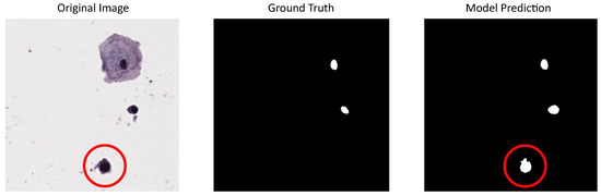 Due to the limited number of images available in our dataset for model training but the sufficient number for evaluation, we used CNseg for training and reserved our dataset for testing. This choice was made because CNseg cytology images exhibit characteristics similar to those of our dataset, allowing the models to learn relevant features while ensuring a robust evaluation on an independent set. Performance metrics for the tested models using our dataset (or institutional dataset) are summarized in Table 1. It can be seen that these metrics are lower than when using public datasets, similar to results obtained in other works that also use private datasets like the one in Hu et al. (2024) [36], where the DSC of the best-proposed model is 0.68 and the IoU is 0.51, values that are close to the results using our dataset. Particular characteristics in the image acquisition and digitalization process for private datasets could lead to this performance decreasing. In our dataset (institutional dataset), in the random mode, some image regions contained cells with blurred nuclei, making annotation more challenging and less reliable compared to clearly defined nuclei. Despite this, the best-tested model was able to detect even these blurred nuclei, which could potentially support future models in the generation of synthetic images. An example of this situation can be seen in Figure 6.
