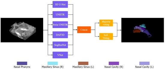Moreover, the introduction of novel datasets, such as the NasalSeg [] dataset, has begun to address the scarcity of large-scale, annotated imaging data necessary for training and benchmarking advanced segmentation models. This work proposes an ensemble-based segmentation framework that synergistically combines multiple 3D architectures, 3D-NASE. Our approach integrates CNN-based models with transformer-based networks that exploit self-attention mechanisms. By fusing these complementary architectures, our method aims to enhance segmentation robustness and improve generalization across anatomical variations and heterogeneous imaging conditions. It aims not only to refine segmentation accuracy but also to provide a reliable basis for subsequent radiomic analysis. In summary, the research question we aim to address in this work is how can an ensemble-based segmentation framework that integrates both CNN-based and transformer-based architectures be designed to enhance the accuracy, robustness, and reproducibility of 3D nasal CT segmentation for improved clinical diagnosis and treatment planning?