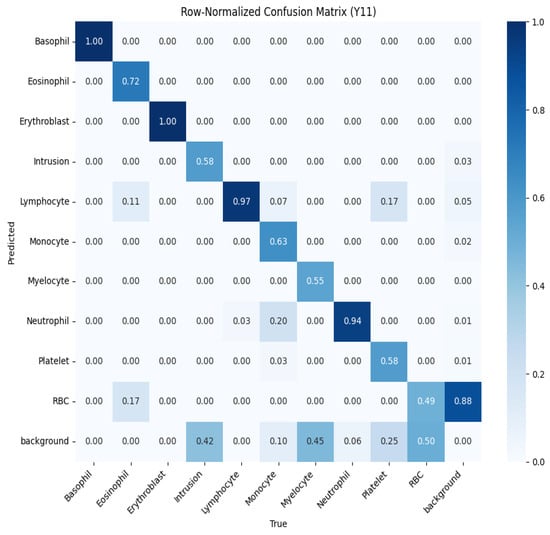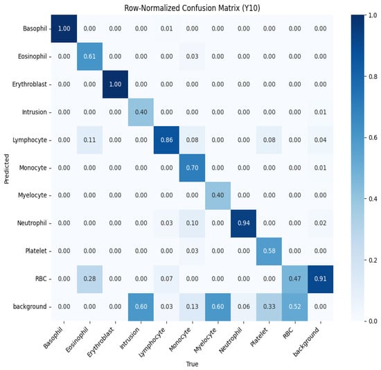- Annotation standardization: Converted all labels to YOLO-compatible text format, where each image is associated with a .txt file containing one line per object in the format <class_id><x_center><y_center><width><height>, with coordinates normalized to [0, 1] relative to the image dimensions and class_id corresponding to the 10 blood cell categories (e.g., 0 for basophil, 1 for eosinophil, etc.).