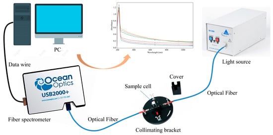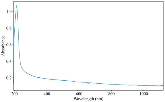 The UV–Vis spectroscopy acquisition system consists of several key components, including a light source, sample cell, spectrometer, and a computer for data processing, as shown in Figure 1. The light source employed in the system is a DH-2000 deuterium-halogen light source, which emits light across a broad range of 190 to 2500 nm (Ocean Optics, Orlando, FL, USA). The sample cell, with an optical path length of 10 mm, allows for efficient transmission of light through the water sample. The USB2000+ spectrometer, which measures wavelengths from 165 to 1200 nm with a resolution of 0.48 nm, is employed to capture the spectral data (Ocean Optics, Orlando, FL, USA). Data acquisition and management are handled by OceanView software 2.0.8, which stores full wavelength spectra or data from specific wavelength ranges. The collected data is processed and modeled by a computer, with appropriate software applied for further analysis. One of the UV–Vis spectra obtained from the water samples is shown in Figure 2, providing a visual representation of the data for COD analysis.