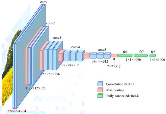 VGG-16 is a prominent convolutional neural network developed by the Visual Geometry Group (VGG) at the University of Oxford in 2014 [30]. It has achieved impressive results in numerous image-processing tasks and remains one of the most effective models today. The architecture of VGG-16 consists of 21 layers, which include 13 convolutional layers, 5 pooling layers, and 3 fully connected layers, as shown in Figure 3. The name “VGG-16” originates from the fact that only 16 layers, comprising the convolutional and fully connected layers, contain weights. The model has 64 filters in the first convolutional layer, 128 filters in the second, 256 filters in the third, and 512 filters in both the fourth and fifth layers. One of the key design points of VGG-16 is its use of small 3 × 3 convolutional filters, which, combined with its deep architecture, enable it to effectively capture intricate features. Initially designed for image classification, VGG-16 gained significant recognition for its high accuracy in the ImageNet competition. Its straightforward design and effectiveness have made it a popular choice for a wide range of computer vision tasks. Additionally, VGG-16 serves as a foundation for many transfer learning applications, demonstrating its versatility in various domains [31,32].