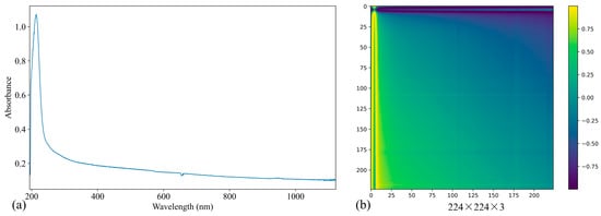 An example of transforming a one-dimensional UV–Vis spectrum into a two-dimensional image is shown in Figure 4b, with the original spectrum displayed in Figure 4a. To meet the input requirements of the CNN, specifically VGG-16, the grayscale images need to be transformed into color images. This is achieved by applying a color map, such as Viridis, to the grayscale images. The color map enhances the visual representation of the data, making it suitable for processing by CNN. Additionally, the color images are resized to 224 × 224 × 3 to ensure compatibility with the input dimensions required by VGG-16. This resizing process standardizes the images, allowing them to be fed into the model for feature extraction and subsequent analysis.