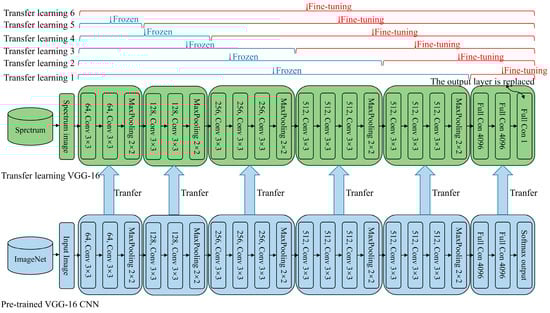 The weights of the transfer learning model play a crucial role in ensuring good performance, even with a small dataset, as long as the dataset used to train the pre-trained model is sufficiently large. In this approach, only the later layers of the new model are trained. This training strategy is effective in reducing the need for extensive data while maintaining model performance. Transfer learning offers several key benefits. It significantly reduces training time and the amount of labeled data required for the new task. Low-level features from the early layers of the model are generally applicable across a variety of tasks, whereas high-level features from the later layers are more task-specific [39,40]. The front layers of the model serve as universal feature extractors, which can be applied to many different tasks, enhancing the model’s versatility. The proposed method employs the VGG-16 model with transfer learning for processing spectrum images. This model consists of a pre-trained VGG-16 CNN for extracting universal features. A gradual thawing strategy is employed in this approach, where the later layers are fine-tuned first, followed by the gradual adjustment and fine-tuning of the front layers. This strategy optimizes the model’s parameters, ensuring that the best transfer learning model is achieved. Figure 5 illustrates the details of the transfer learning-based network based on VGG-16 researched in this study.