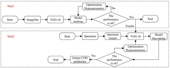 The proposed transfer model closely resembles the pre-trained VGG-16 CNN, with one key modification: the output layer. The original fully connected layer, which contains 1000 neurons, is replaced by a new layer consisting of a single neuron for regression tasks. This modification ensures that the model is suitable for continuous value prediction, such as in the case of COD detection from spectrum images. Structures and weights from the pre-trained CNN model are transferred to the new model, improving its performance and allowing for more efficient learning. This approach enables fine-tuning of the VGG-16 model for the spectrum image task without the need for complete retraining, significantly reducing computation time. To further refine the model, the mean squared error (MSE) loss function is employed during fine-tuning. The MSE loss function, as defined in Equation (6), ensures that the model’s predictions closely match the actual values by minimizing the square of the differences between predicted and true values.