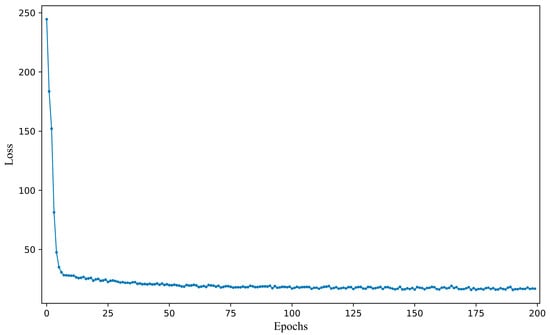 The transfer learning model 4 was fine-tuned after determining the optimal hyperparameters. The Adam optimization algorithm was employed to optimize the network parameters during the fine-tuning process. To ensure that the best-performing model was employed during the testing stage, the loss was saved at the end of each epoch, as shown in Figure 7. The loss value exhibited a significant decrease in the first six epochs and began to stabilize around the 100th epoch, indicating that the model was gradually converging. After 100 epochs, the loss value remained largely unchanged, indicating that the model was approaching convergence. The relatively quick convergence of the model can be attributed to the small sample size and the simple mapping relationship between the UV–Vis spectra and the COD values, which facilitated the learning process. Despite the model having converged, the final loss value only decreased to around 15, rather than reaching 0, which can be attributed to factors such as noise and turbidity in the spectra, which introduced some interference during fine-tuning.