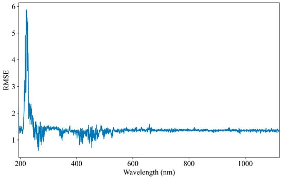 The feature importance analysis reveals a strong correlation between the spectral feature importance curve (Figure 8) and the absorption spectrum (Figure 2). It is worth noting that the most critical spectral region in Figure 8 that has the greatest impact on COD prediction is aligned with the main absorption peak around 250 nm in Figure 2. This indicates that the model is effectively identifying and prioritizing the relevant features that are crucial for accurate COD prediction. The model’s ability to automatically extract features related to COD further confirms its capacity to learn and adapt to important spectral patterns. By focusing on the main absorption peak, the model captures essential information that directly correlates with COD levels in the water samples. However, it is also observed that the model occasionally learns irrelevant features, such as the 660 nm peak, which is likely a result of spectrometer noise rather than any meaningful COD-related information. This extraction of irrelevant features can negatively influence the model’s accuracy. The inclusion of such noise introduces unwanted variability into the prediction process, reducing the model’s accuracy in detecting COD concentrations. Moreover, non-COD-related factors, such as turbidity and organic salts, may introduce further interference in the UV–Vis spectroscopy data. These external factors lead to inaccuracies in the COD detection process, highlighting the need to carefully consider potential influencing factors when training and deploying models for real-world applications.