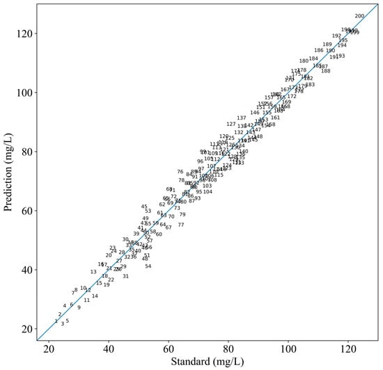 The linearity between the predicted and standard values was shown in Figure 9, with higher accuracy indicated by the scatter points being closer to the fitted line. The strong agreement between the predicted and standard values suggests that the model possesses good robustness and adaptability, making it highly reliable for accurate COD prediction in water samples. Specifically, the proposed method demonstrated a clear linear relationship between the predicted and standard COD values, with the scatter points closely following the straight line that has a slope of 1. Importantly, no significant error growth was observed as the COD concentration increased, indicating that the model performs consistently across a wide range of COD concentrations, particularly between 20 and 120 mg/L. This stability in error distribution further highlights the generalization ability of the model. The experiments confirm that the method effectively employs spectral information from across the entire UV–visible spectrum, ensuring comprehensive feature extraction for accurate COD predictions.