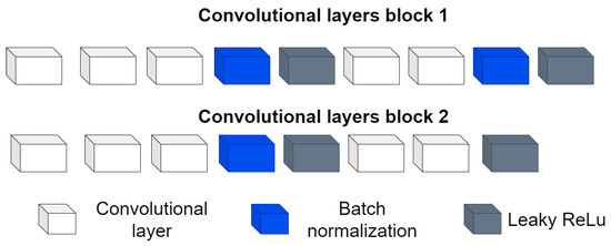 - Convolutional block: This is formed of 2 parts, as shown in Figure 4, the convolution filters are filters of size 3 × 3 with a stride of 1, and the number of filters increases, as shown in Figure 5, starting with 32 filters and doubling the number at each convolution stage. The purpose of these convolutional layers is to extract features from the LV image, which will later be used to link them with the pose and shape features extracted from the previously trained LV-PDM. In addition, there are maxpooling layers in between each convolution stage with a stride of 2; with maxpooling, the dimensionality of the problem is reduced and the most important features of the image are preserved. Furthermore, this allows the training process to be lighter, since it reduces the number of parameters that have to be learned by ShapeNet. An overview of this block is shown in Figure 5.