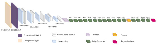 The architecture is inspired by encoder–decoder architectures, taking as a basis the encoder part and its power for image feature extraction and dimensionality reduction, hence the origin of the first block. Then, a second block formed by fully connected layers and a regression layer are used to relate the features extracted in the first block with the pose and shape values extracted from the PDM. This architecture is designed to be used and implemented on off-the-shelf computing equipment. The two blocks mentioned above and the full architecture are detailed below.