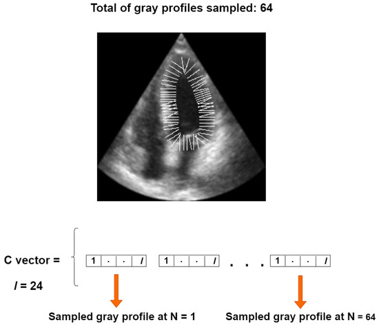 Our objective function is based on a set of perpendicular gray level profiles of length l, sampled from each landmark point in an image of the training set, as proposed in [30]. All gray profiles are concatenated into a single vector, referred to as the C vector, with a length of for our 64-point LV-PDM, as illustrated in Figure 7.