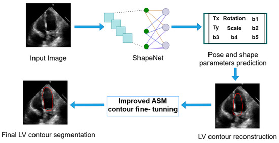 ShapeNet predicts the optimal pose and shape parameters, including rotation ), translation (), and scale (), specific to the new image. Using these parameters, the left ventricle contour is reconstructed based on Equations (1) and (2). Once the shape predicted has been reconstructed, this contour acts as an automatic initialization for the improved ASM and will undergo fine-tuning to obtain the final LV contour. Figure 8 depicts the segmentation workflow described.