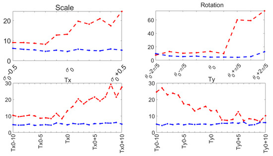 Capture range tests were performed on the ASM reported here (Section 3.3), and compared to the original ASM reported by Cootes [30]. The mean shape was manually aligned to the left ventricle on an US image, and it was automatically adjusted to the contour of the left ventricle using the original local search of the ASM and our function optimization method. This was repeated for a range of values around the initial manual pose values: . The range of values for each pose parameter and the contour segmentation errors for each method are shown in Figure 10 for 30 diastole images.