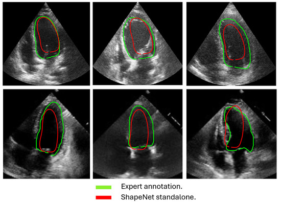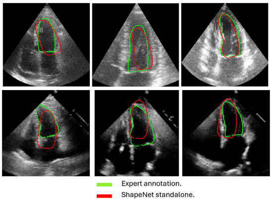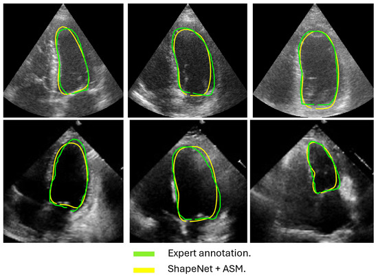 Despite the strengths of the proposed method, some limitations should be acknowledged. The CAMUS dataset, although it was augmented to 4800 images, remains relatively small for deep learning applications, and this may have affected the model’s generalization. In addition, the ShapeNet + improved ASM automatic initialization introduces a dependency that may reduce accuracy if there are significant deviations in initial conditions, such as patient positioning or heart orientation. The effectiveness of the improved ASM remains dependent on ShapeNet’s initialization quality. While ShapeNet’s ensemble architecture and the PDM’s shape constraints help mitigate this dependency, extreme imaging artifacts or anatomical anomalies may still lead to suboptimal ASM convergence. This limitation was evidenced in the EchoNet HD variance (10.21 px), where acoustic shadowing occasionally compromised initialization (Figure 12, bottom right). Nevertheless, our experimental results demonstrated that this combined approach remains clinically viable. ShapeNet’s parameter regression achieved Dice scores superior to 0.65, even in challenging cases (Table 2), providing sufficiently accurate initialization for ASM refinement. Furthermore, the ASM’s global objective function effectively corrected local errors when initialization was imperfect, as demonstrated by its superior performance compared to the original ASM (Figure 10).