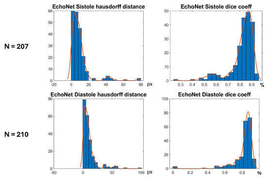 In Figure 16 are shown histograms of the ShapeNet + improved ASM approach for the Dice coefficient and Hausdorff distance values for systole and diastole for the EchoNet dataset. It can be observed that 75.84% and 77.61% of the cases for systole and diastole, respectively, fell within the range of 0.8 to 1. Similarly, for the Hausdorff distance, the majority of values were concentrated between 0 and 10 pixels, 68.11% and 66.66%, for systole and diastole, respectively. The density concentrated in the previously mentioned values demonstrate that our algorithm performed well and that the results were consistent, even with a completely new dataset, as was the case with EchoNet, in contrast to the methods shown in Table 4, which were trained and tested on images from the same dataset.