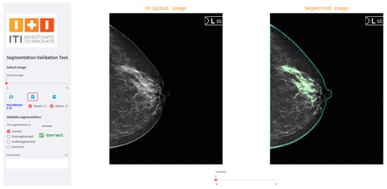 Figure 2 shows a screenshot of the interface used in our breast dense tissue segmentation use case. In this version, the interface was tailored to display digital mammograms and associated masks. A generalized version of the tool has also been developed and made publicly available via GitLab (https://egitlab.iti.es/praia-salud/segmentation-validation-tool.git, (accessed on 1 May 2025)). This version is designed to be compatible with any segmentation task, as it can be easily configured for different label categories and image modalities.