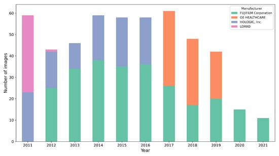 We utilized a dataset comprising 500 studies obtained from the Hospital del Mar Research Institute (IMIM). This dataset was exclusively extracted for the three-blind validation presented here. It consists of mammograms from four different acquisition devices, collected over a period of 10 years (2011–2021). To simplify the procedure, only craniocaudal (CC) views were used. All the mammograms are of the type for presentation. Figure 3 illustrates the distribution of mammograms by year and acquisition device, highlighting a well-balanced representation across five distinct devices over the covered period. This diverse composition emphasizes the dataset’s robustness and suitability for validating segmentation performance.