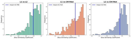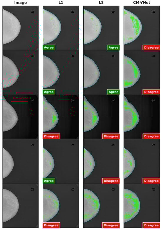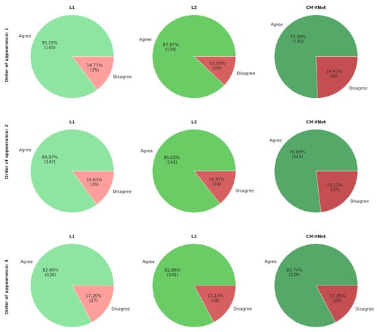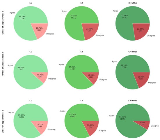 Figure 5 presents the agreement percentages for each evaluated labeler (L1, L2, and CM-YNet). The agreement with manual segmentations (L1 and L2) is higher than that with the automatic segmentation (CM-YNet). These percentages are based on a total of 1500 segmentations.