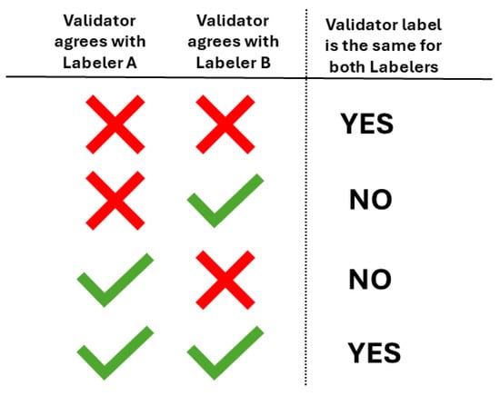Given two labelers, which in our case can be any combination of L1, L2, or CM-YNet, we indicate if the validator marked the same label (agreement or disagreement) for both labelers.